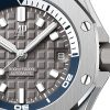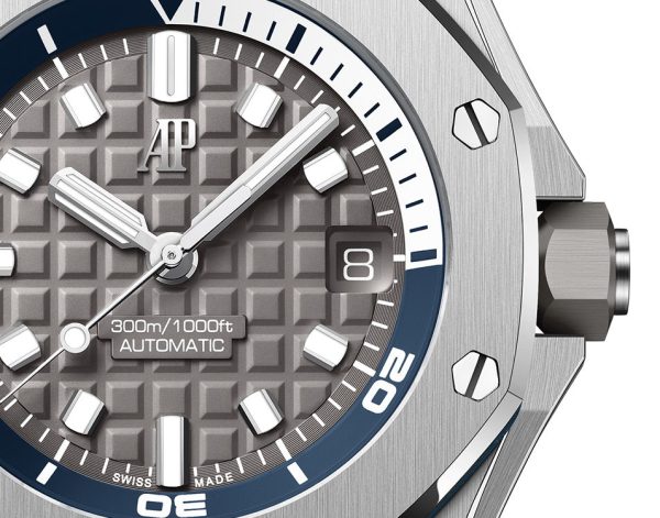 Unworn Audemars Piguet Royal Oak Offshore DIVER 15720ST.OO.A009CA.01. 42 mm, Grey dial with “Méga Tapisserie” pattern, white gold applied hour-markers and Royal Oak hands with luminescent coating, blue rotating inner bezel with zone from 60 to 15 minutes in white, Stainless steel case, glareproofed sapphire crystal and caseback, black ceramic screw-locked crowns, 4308 calibre, Selfwinding movement, 60 h power reserve, 32 jewels, Grey rubber strap with AP folding clasp. Water resistant to 300 m.