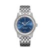 Breitling Navitimer Automatic 38 watch, polished stainless steel, 38mm case, Reference A17325211C1A1. This model has Blue dial with a fine sunray finish. Silver dial flange with Tachymeter scale around the outer rim. Polished luminous silver-tone hour and minute hands and applied steel index hour markers. Fine printed minutes/seconds track. Date window located the 6 o’clock positions. Stainless steel Pull / push non screw-locked crown with a two gaskets and logo Breitling. The dial closed by a Cambered sapphire crystal, glareproofed both sides. The screwed solid case back is made of Stainless Steel. The watch is equipped bidirectional rotating beaded Stainless Steel bezel. The watch is self-winding mechanical Breitling in-house caliber 17 contains 25 jewels and has an approximate power reserve of 38 hours. This model presented on a Polished Straight Stainless Steel Navitimer bracelet with a Stainless Steel Folding Clasp with Safety Latch. The water resistance is up to 30m/100ft.