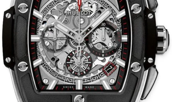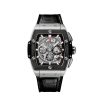 Hublot Spirit of Big Bang Titanium 45mm watch. Brushed/satin finished titanium case with polished beveled corners, Reference 601.NX.0173.LR. This model has Sapphire crystal transparent dial with bold brushed finished Stainless Steel minute and hour hands with luminous filled top and skeletonized bottoms. Applied brushed Stainless Steel ‘Applique’ index hour markers with luminous fill. Black inner bezel flange at the dial perimeter with a red minute/seconds track. Small running seconds sub-dial hand located at the 9 o’clock position. Visible skeletonized date wheel. Current date displayed between the 4 and 5 o’clock position, highlighted by a black background and a blue border. Chronograph Stopwatch function: large central seconds counter with the “H” logo as a counter-weight; black-rimmed 30-minute sub-dial counter located at the 3 o’clock position; black-rimmed 12-hour sub-dial counter located at the 6 o’clock position. Brushed and polished titanium crown and chrono buttons with black insert. The crown has Pull / Press function, the Hublot logo engraved on it. The dial closed by a Scratch-resistant Sapphire Crystal with Anti-reflective Treatment. Of Sapphire Crystal made transparent case back. The watch is equipped fixed titanium bezel with Microblasted (dark shade of finishing) recessed zones, secured with 6 polished “H” style Titanium screws. Lateral case center band and bezel lugs of black composite resin. The watch is self-winding Skeleton Chronograph Movement Hublot Caliber HUB 4700, contains 31 Jewels and has an approximate power reserve of 50 hours. This model presented on a Black “Gummy-Alligator” strap: Alligator on the top-side and rubber on the underside and edges with Titanium Deployant Buckle Clasp. The water resistance is up to 100m/330ft (10 ATM).