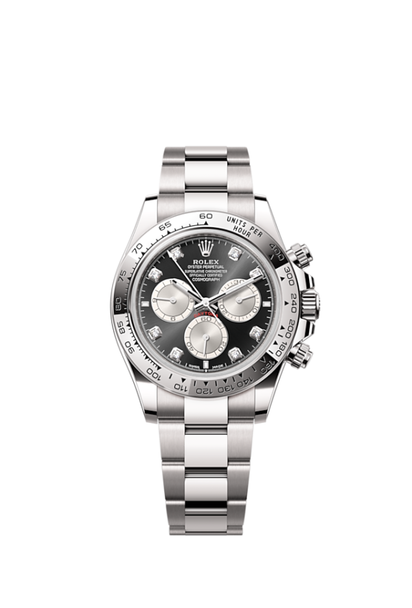 Unworn watch Rolex Cosmograph Daytona 40mm, 18k White Gold, Ref# 126509-0002. Born for motor racing, the watch combines sporty chic with versatility, making it a must-have for lovers of the fast lanes and the finest cars. The luxurious Rolex Cosmograph Daytona is synonymous with excellent workmanship, first-class technical features and unique looks. Proof of this is the stunning Bright black dial and the crisply readable Chromalight display with a long blue glow and stylish set with diamonds hour markers. Spiral-shaped Silver counters complement it at 3, 6 and 9 o’clock, which record the hours, minutes and seconds from the start of the race. The elegant sword-shaped hour and minute hands are filled with high-definition luminescent material. The graceful central seconds hand allows you to count time with an accuracy of 1/8 second. All details are made of 18k White Gold. A well-readable minute scale is applied along the outer contour of the dial. All this charm is complemented by a ribbed, for a comfortable grip, screw-down crown in 18k White Gold with the Rolex logo, which has a triple Triplock water-resistance system. At the 2 and 4 o’clock positions are the chronograph control buttons made of 18k White Gold. The dial is covered with a scratch-resistant sapphire crystal and a solid 18k White Gold case back. The Fixed 18k White Gold monobloc bezel with engraved tachymetric scale enhances the functionality of the watch. The model is equipped with a manufacture Rolex Self-winding mechanical movement Calibre 4131, contains 47 jewels and has an approximate power reserve approximately of 72 hours. This spectacular timepiece is presented on an 18k White Gold Oyster, three-piece solid links bracelet. The 18k White Gold Folding Oysterlock safety clasp with Easylink 5 mm comfort extension link, made using own unique Rolex technologies, guarantees maximum comfort on the wrist. Water resistant up to 100m/330ft (10 ATM).