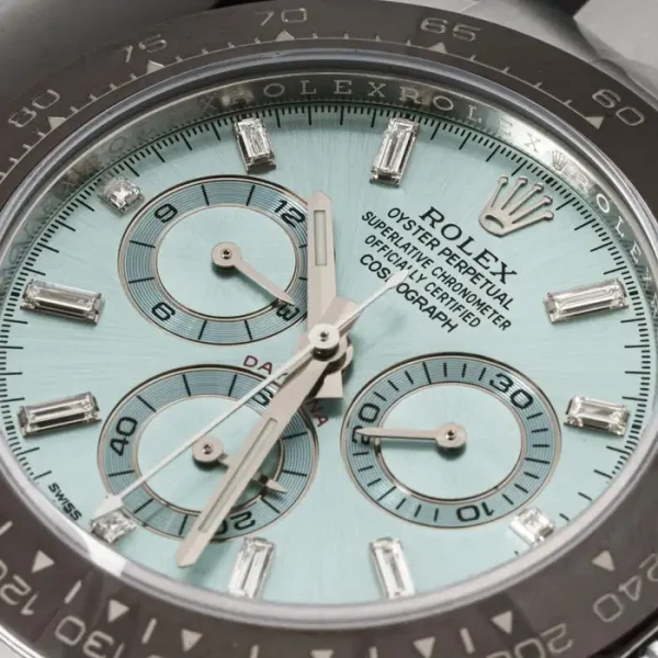 The ice blue dial is the discreet and exclusive signature of a Rolex platinum watch. Rolex uses platinum, the noblest of metal, for the finest of watches. These exclusive dials can be found only on the Day-Date and the Cosmograph Daytona.