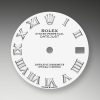- Dial color: White dial with a applied polished 18k White Gold Roman numerals as hour markers