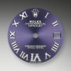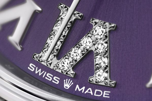 - Dial color: Aubergine dial with a fine sunrays, applied polished 18k White Gold Roman numerals as hour markers and 11 diamonds on large numeral VI