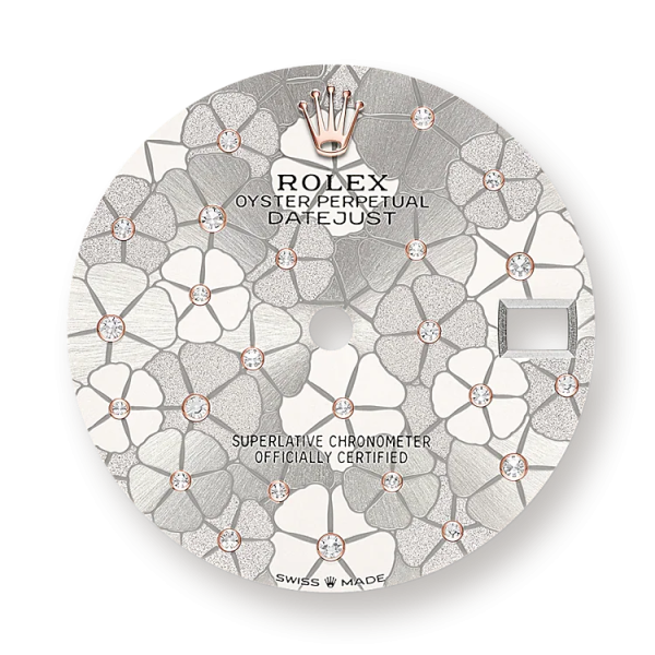 - Dial color: Silver dial with floral motif and 24 Diamonds in 18k Everose Gold settings