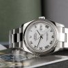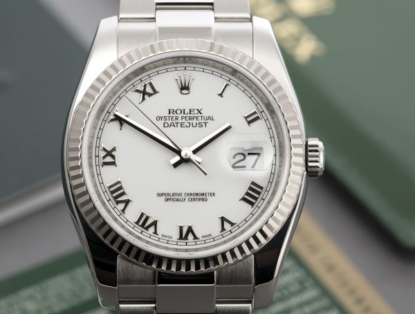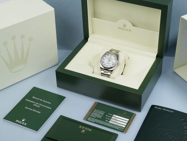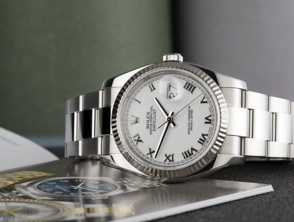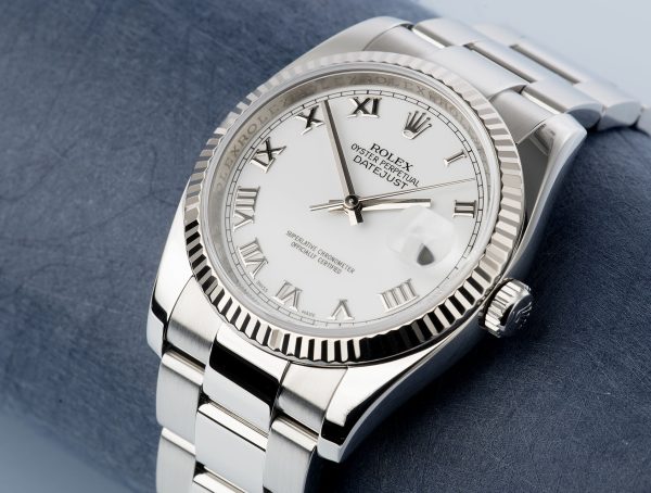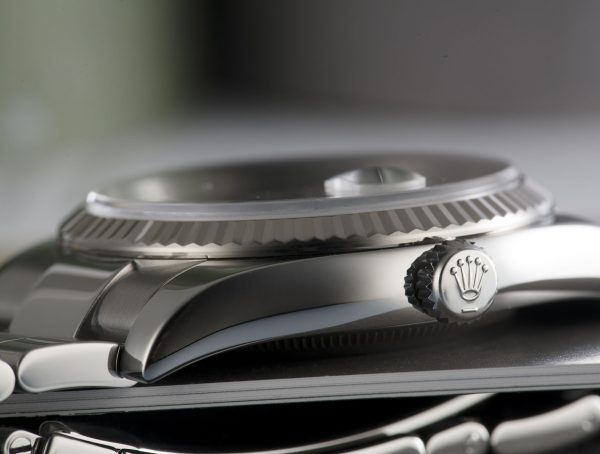 The Rolex fluted bezel is a mark of distinction. Originally, the fluting of the Oyster bezel had a functional purpose: it served to screw the bezel onto the case helping to ensure the waterproofness of the watch. It was therefore identical to the fluting on the case back, which was also screwed onto the case for waterproofness, using specific Rolex tools. Over time, the fluting became an aesthetic element, a genuine Rolex signature feature. Today the fluted bezel is a mark of distinction, in gold on this Datejust 41.