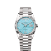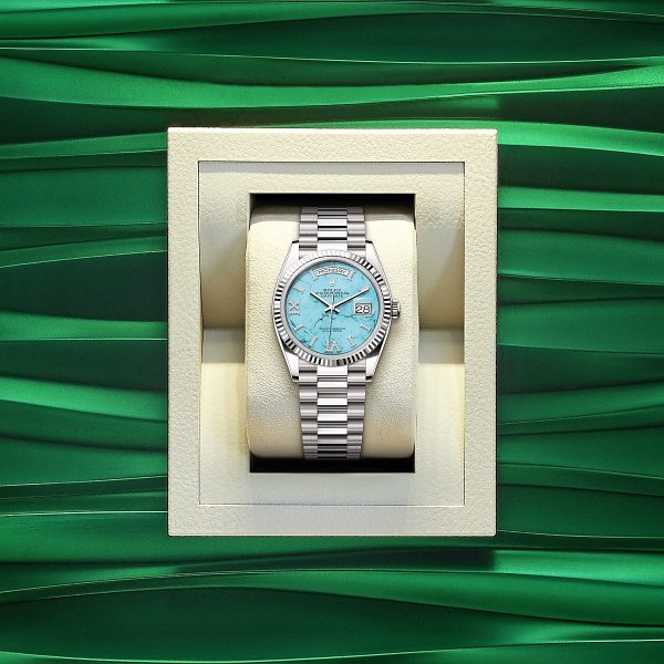 Unworn watch Rolex Day-Date 36, 18k White Gold, 36mm, Ref# 128239-0044. New for 2023 in the Oyster Perpetual Day-Date 36, series are watches with dials made of decorative stones. Thanks to the unique crystallized effects, matrices and veins of aventurine, carnelian and turquoise, and their skillful processing, each dial turns into a unique work of art, being a worthy addition to the rest of the flawless Day-Date details. As always elegant and luxurious Day-Date 36 – is an excellent choice for people who appreciate unique beauty, high style and absolute comfort. The turquoise dial will not leave indifferent any connoisseur of beauty and sophistication. Its index hour markers and Roman numerals VI and IX in 18k White Gold are respectively set with 32 and 24 diamonds, , using a flawless setting and leveling technique that highlights the stones’ subtle brilliance. The classic polished hands made of 18k White Gold look amazing on such a dial, emphasizing the sophistication of the model. The date indicator is traditionally placed at the 3 o’clock position. At the 12 o’clock, position is a semi-circular window showing the day of the week in full, providing an instantly recognizable, unique design of Day-Date. The ribbed screw-down crown in 18k White Gold Triplock with double watertight system, adorned with the Rolex logo, is a traditionally recognizable part of Rolex watches. The dial is covered with a scratch-resistant anti-reflective sapphire crystal and a Cyclops lens above the date with double anti-reflective coating. A solid 18k White Gold screw-down case back with fine fluted edges, closes the movement. The fluted fixed 18k White Gold bezel is not only an aesthetic element of this watch, but also a true hallmark of Rolex. The in-house Rolex mechanical movement, caliber 3255, contains 31 jewels and has an approximate power reserve of approximately 70 hours powers. This delightful timepiece is presented on a 18k White Gold President bracelet with semi-circular 3-piece links for flawless beauty. It features Rolex’s original concealed folding Crownclasp to secure the watch on your wrist. Water resistant up to 100m/330ft (10 ATM).