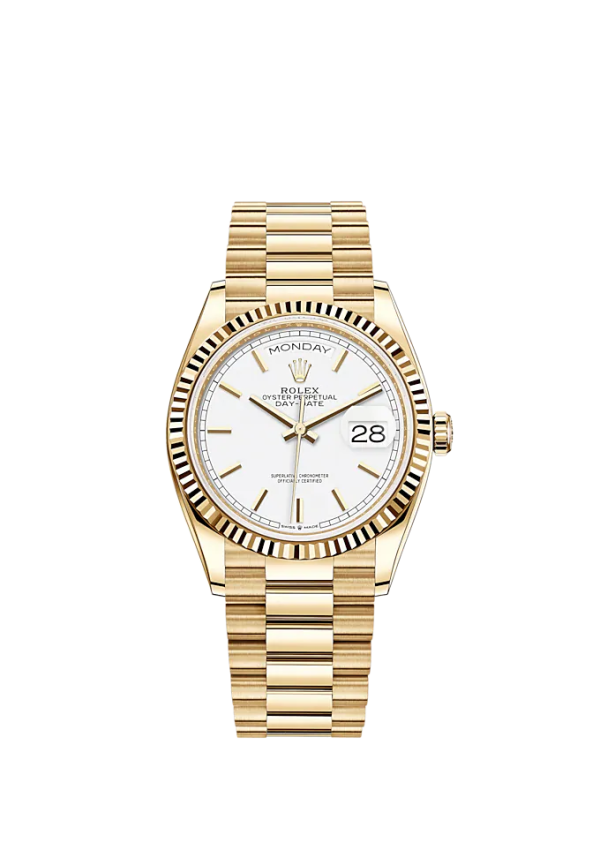 Unworn classic Rolex Day-Date, 36mm, 18k Yellow Gold, Ref# 128238-0081 – luxury, elegance and practicality.