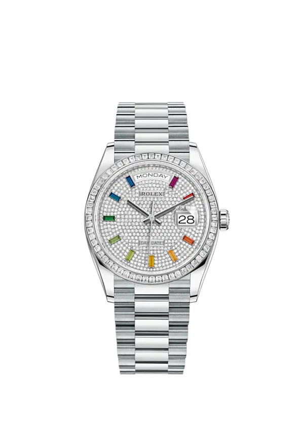 Unworn classic Rolex Day-Date, 36mm, Platinum and Diamonds, Ref# 128396tbr-0006 – luxury, elegance and practicality.