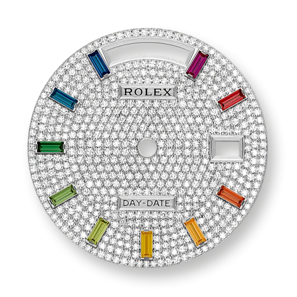 Dial color: Diamond-paved dial with 10 baguette-cut, rainbow-coloured sapphires