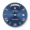 - Dial color: Bright blue dial with a fine sunrays and applied large polished 18k White Gold Roman numerals as hour markers
