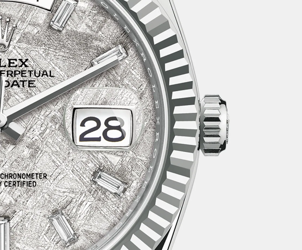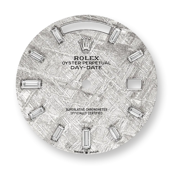 - Dial color: Meteorite dial with a 10 Baguette-cut Diamonds as hour markers framed in 18k White Gold