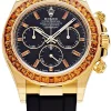 Daytona Cosmograph 40mm in Yellow Gold with Orange Sapphire Bezel on Strap with Black Dial – Orange Baguette Markers 116588SACO