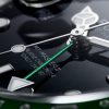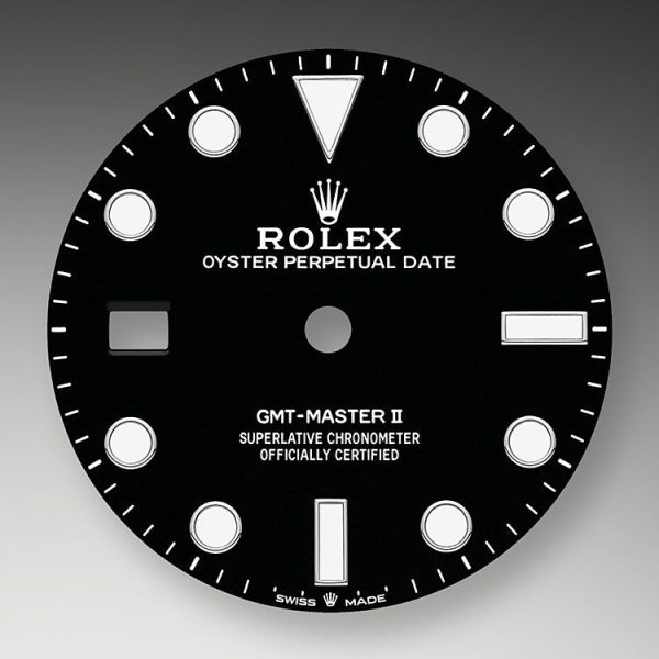 - Dial color: Black lacquer dial features 18K white gold hands with round, rectangular and triangular indexes. The GMT hand is green lacquered. All the hands and hour-markers are filled with Chromalight, which offers a striking blue glow