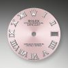 - Dial color: Pink dial with a fine sunrays and a applied polished 18k White Gold Roman numerals as hour markers