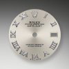 - Dial color: Silver dial with a fine sunrays and a applied polished 18k White Gold Roman numerals as hour markers