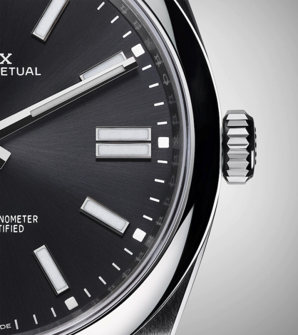 Rolex Oyster Perpetual No Date, Brushed Stainless Steel case with polished finished sides 41mm watch. This model has Bright black dial with highly legible Chromalight display with long-lasting blue luminescence with a fine sunray finish. Applied polished index hour markers with luminous fill. Polished hands, hour and minute hands with luminous fill. Fine printed minute/seconds and fractions of a second track on teh dial perimeter. Moreover, every five minutes are marked with a luminous dot. Polished Stainless Steel screw-down crown with Rolex’s patented “Triplock” triple waterproofness system, ensuring that the crown screws down against the Oyster case as securely as a submarine hatch. The dial closed by a Scratch-resistant Sapphire Crystal and solid case back made. The watch is equipped domed fixed polished silver-tone Stainless Steel bezel. The watch is mechanical self-winding Manufacture Rolex 3230 contains 31 Jewels and has an approximate power reserve of 70 running the time only. This model presented on Brushed Stainless Steel Oyster bracelet with flat three-piece links and a Folding Oysterlock safety clasp with Easylink 5 mm comfort extension link. The water resistance is up to 100m/330ft (10 ATM).