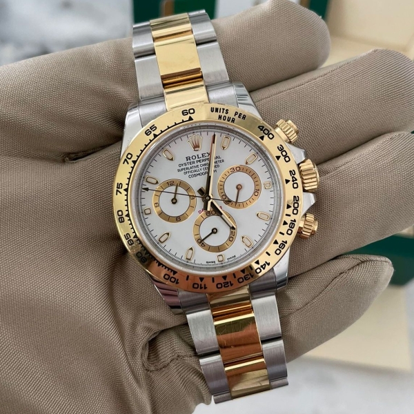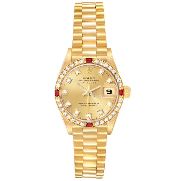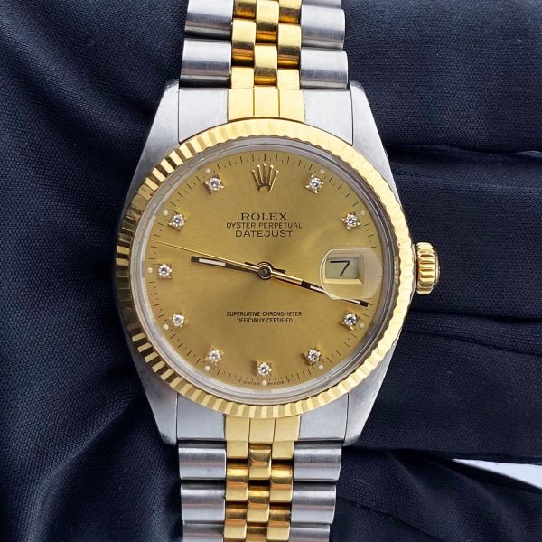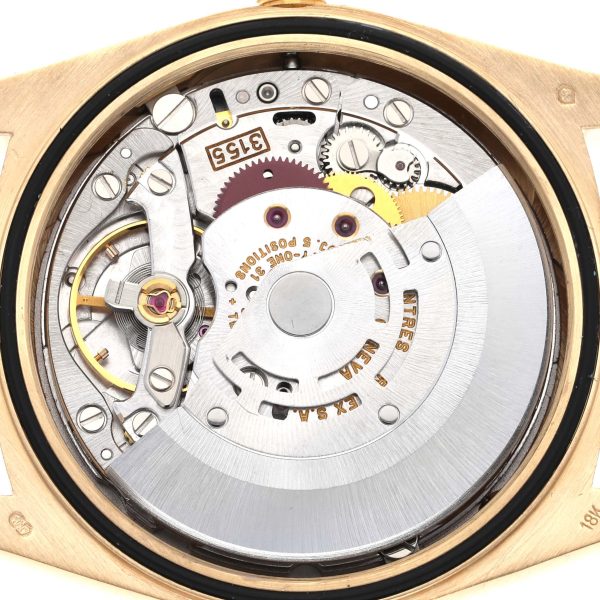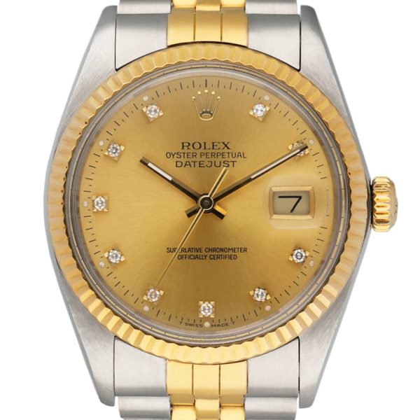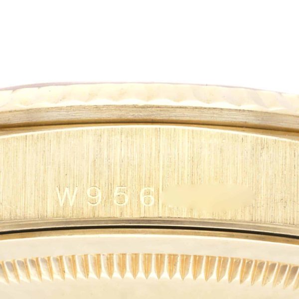 | Dial: | Champagne dial with original Rolex factory diamond hour markers. Sweep center seconds. Outer minute and 1/2 seconds divisions, aperture for day at 12, aperture for date at 3. |