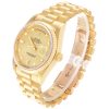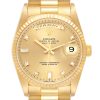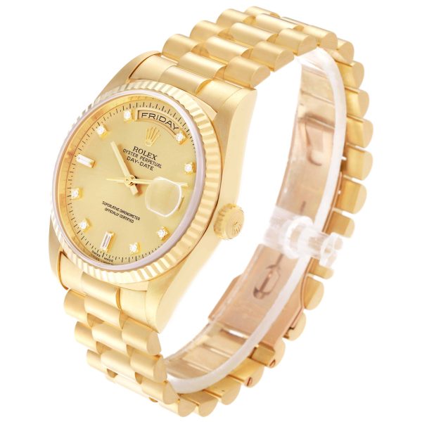 Rolex President Day Date Diamond Dial Mens Watch 18238. Automatic. oyster case 36.0 mm in diameter. Rolex logo on the crown. fluted bezel. Scratch resistant sapphire crystal with cyclops magnifier. Champagne dial with original Rolex factory diamond hour markers. Sweep center seconds. Outer minute and 1/2 seconds divisions, aperture for day at 12, aperture for date at 3. president bracelet with hidden clasp. Fits 7³ wrist.