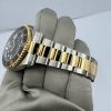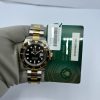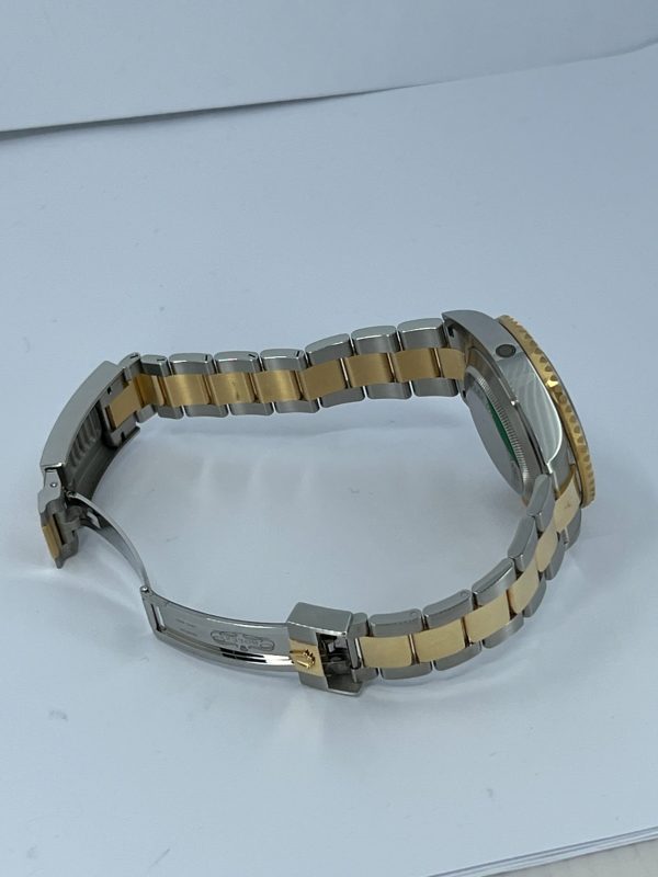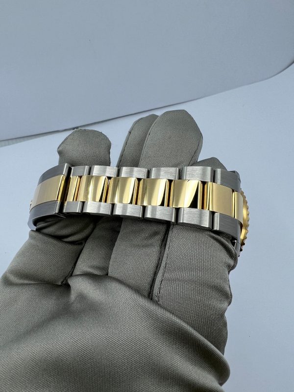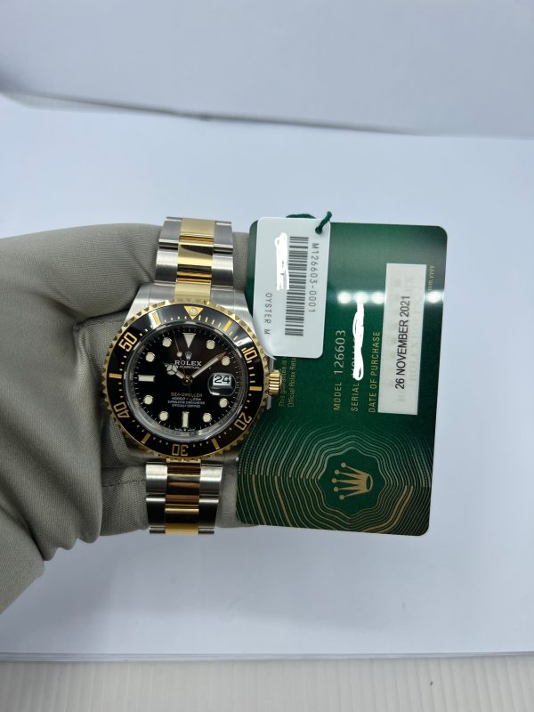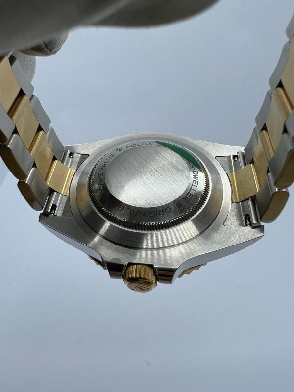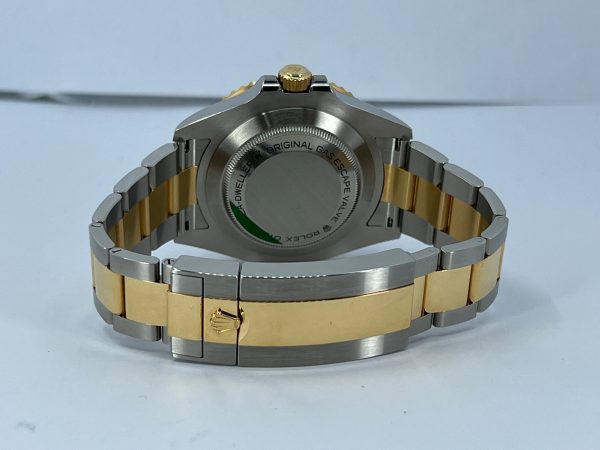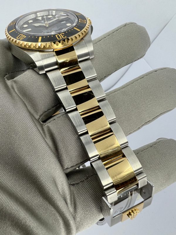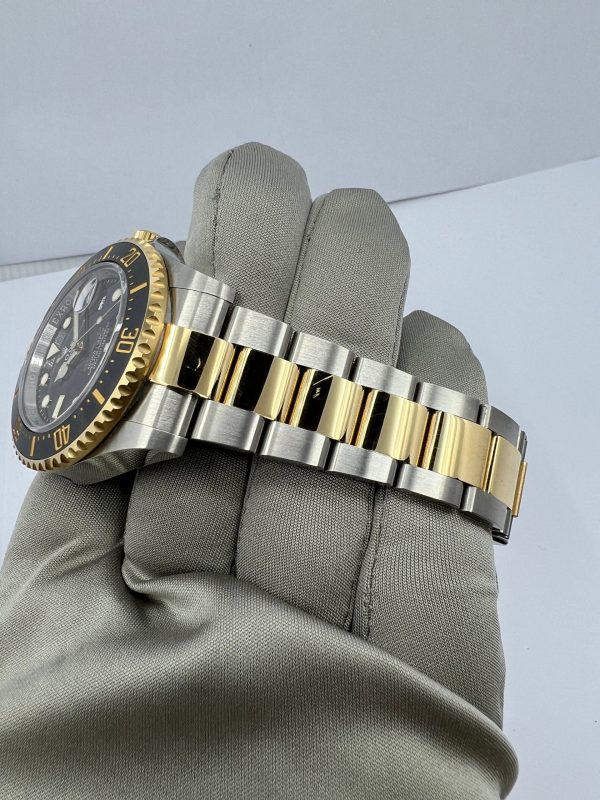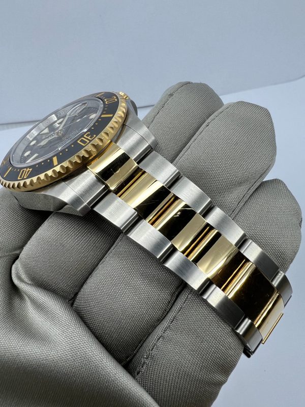 Rolex Sea-Dweller, 43mm watch of polished Stainless Steel and 18k Yellow Gold. This model has black dial with a polished 18k Yellow Gold hour, minute and seconds hands in Mercedes-logo and Breguet-style sword shape with luminous fill. Applied polished 18kt Yellow Gold rimmed doty and index hour markers with luminous fill. Fine printed minute/seconds track on the dial rim. Highly legible Chromalight display with long-lasting blue luminescence. Polished 18kt Yellow Gold patented “Triplock” locking crown ensuring that the crown screws down onto the Oyster case as securely as a submarine hatch. The dial closed by a Scratch-resistant Sapphire Crystal and solid case back made. The Watch has Centre hour, minute and seconds hands. Stop-seconds for precise time setting. Date window at 3 o’clock with a cyclops magnifier. The watch is equipped unidirectional rotatable polished 18k Yellow Gold bezel with knurled corners for enhanced grip. Black “Cerachrom” bezel insert, made of ceramic which is extremely hard, durable and highly scratch-resistant. Ceramic has excellent corrosion resistant properties and is unaffected by ultraviolet rays so the color will not fade. It features a 60-minute immersion scale engraved indexes and numbers with PVD yellow gold coated graduation with a luminous dot at the starting triangle. The movement is mechanical self-winding 3235, containing 31 Jewels and 70 hours of power reserve. The Rolex Oyster bracelet of brushed outer links Stainless Steel and polished center links 18k Yellow Gold with folding Oysterlock safety clasp with Rolex Glidelock extension system. The water resistance is up to 1220m/4000ft.