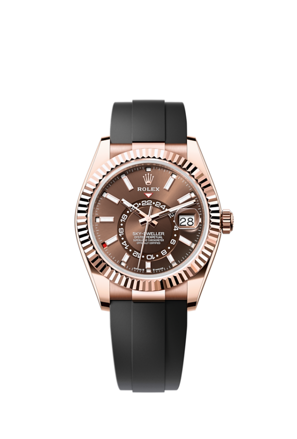 Unworn watch Rolex Sky-Dweller, 42mm, 18k Everose Gold, Ref# 336235-0002. New for 2023, a true masterpiece of engineering. Elegant and versatile, this stunning timepiece is the perfect luxury accessory for the modern traveler. This superb chronometer features a Chocolate dial, which is the perfect backdrop for the luminous 18k Everose Gold index hour markers and hands, making it easy to read the time even in low light conditions. A well-readable minute scale is applied along the outer contour of the dial. The sophisticated multi-function display makes it easy to keep track of the time in two different time zones. The reference time is displayed in 24-hour format on an off-center dial, while the local time is read using the normal central hands. The annual calendar, named Saros, is powered by a patented mechanism and features an innovative display: the months of the year are shown in 12 windows around the circumference of the dial, behind the hour marker – the current month is displayed in red. The instantaneous date change is related to local time. The ribbed, easy-to-grip Triplock 18k Everose Gold screw-down crown features a triple water-resistance system in and Rolex logo decorated. The dial is covered with a scratch-resistant sapphire crystal with anti-reflective coating and Cyclops lens at the 3 o’clock position. The fluted bezel in 18k Everose Gold is a true hallmark of Rolex. Bidirectional rotatable, it is part of the Ring Command system and, when interacting with the crown, allows the user to select watch functions one by one and adjust them easily, quickly and simply. The model is powered by the innovative in-house Rolex mechanical movement, caliber 9002, contains 29 jewels and has an approximate power reserve of approximately 72 hours. This delightful watch is presented on an Oysterflex bracelet consisting of flexible metal blades coated with high performance elastomer, featuring a patented longitudinal cushion system that stabilizes the watch on the wrist, and fitted with an 18k Everose Gold Oysterclasp clasp. It also features the Rolex Glidelock extension system, developed and patented by the brand. Water resistant up to 100m/330ft (10 ATM).