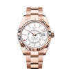 Unworn watch Rolex Sky-Dweller, 42mm, 18k Everose Gold, Ref# 336935-0003. New for 2023, a true masterpiece of engineering. Elegant and versatile, this stunning timepiece is the perfect luxury accessory for the modern traveler. This superb chronometer features an Intense white dial, which is the perfect backdrop for the luminous 18k Everose Gold index hour markers and hands, making it easy to read the time even in low light conditions. A well-readable minute scale is applied along the outer contour of the dial. The sophisticated multi-function display makes it easy to keep track of the time in two different time zones. The reference time is displayed in 24-hour format on an off-center dial, while the local time is read using the normal central hands. The annual calendar, named Saros, is powered by a patented mechanism and features an innovative display: the months of the year are shown in 12 windows around the circumference of the dial, behind the hour marker – the current month is displayed in red. The instantaneous date change is related to local time. The ribbed, easy-to-grip Triplock 18k Everose Gold screw-down crown features a triple water-resistance system in and Rolex logo decorated. The dial is covered with a scratch-resistant sapphire crystal with anti-reflective coating and Cyclops lens at the 3 o’clock position. The fluted bezel in 18k Everose Gold is a true hallmark of Rolex. Bidirectional rotatable, it is part of the Ring Command system and, when interacting with the crown, allows the user to select watch functions one by one and adjust them easily, quickly and simply. The model is powered by the innovative in-house Rolex mechanical movement, caliber 9002, contains 29 jewels and has an approximate power reserve of approximately 72 hours. This delightful timepiece is presented on an Oyster bracelet with one-piece three-piece links in 18k Everose Gold. Thanks to the new hidden fastening system under the bezel, there is a perfect visual continuity between the bracelet and the case. The bracelet features an 18k Everose Gold Oysterclasp folding clasp with Rolex’s original Easylink patented quick extension system of approximately 5mm for added comfort in all circumstances. Water resistant up to 100m/330ft (10 ATM).