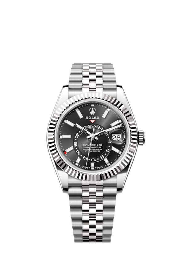 Unworn watch Rolex Sky-Dweller, 42mm, Oystersteel and 18k White Gold, Ref# 336934-0008. New for 2023, a true masterpiece of engineering. Elegant and versatile, this stunning timepiece is the perfect luxury accessory for the modern traveler. This superb chronometer features a Bright black dial, which is the perfect backdrop for the luminous 18k White Gold index hour markers and hands, making it easy to read the time even in low light conditions. A well-readable minute scale is applied along the outer contour of the dial. The sophisticated multi-function display makes it easy to keep track of the time in two different time zones. The reference time is displayed in 24-hour format on an off-center dial, while the local time is read using the normal central hands. The annual calendar, named Saros, is powered by a patented mechanism and features an innovative display: the months of the year are shown in 12 windows around the circumference of the dial, behind the hour marker – the current month is displayed in red. The instantaneous date change is related to local time. The ribbed, easy-to-grip Triplock Oystersteel screw-down crown features a triple water-resistance system in and Rolex logo decorated. The dial is covered with a scratch-resistant sapphire crystal with anti-reflective coating and Cyclops lens at the 3 o’clock position. The fluted bezel in 18k White Gold is a true hallmark of Rolex. Bidirectional rotatable, it is part of the Ring Command system and, when interacting with the crown, allows the user to select watch functions one by one and adjust them easily, quickly and simply. The model is powered by the innovative in-house Rolex mechanical movement, caliber 9002, contains 29 jewels and has an approximate power reserve of approximately 72 hours. This delightful timepiece is presented on a Jubilee bracelet with five-piece links in Oystersteel. Thanks to the new hidden fastening system under the bezel, there is a perfect visual continuity between the bracelet and the case. The bracelet features an Oysterclasp folding clasp with Rolex’s original Easylink patented quick extension system of approximately 5mm for added comfort in all circumstances. Water resistant up to 100m/330ft (10 ATM).