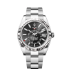 Unworn watch Rolex Sky-Dweller, 42mm, Oystersteel and 18k White Gold, Ref# 336934-0007. New for 2023, a true masterpiece of engineering. Elegant and versatile, this stunning timepiece is the perfect luxury accessory for the modern traveler. This superb chronometer features a Bright black dial, which is the perfect backdrop for the luminous 18k White Gold index hour markers and hands, making it easy to read the time even in low light conditions. A well-readable minute scale is applied along the outer contour of the dial. The sophisticated multi-function display makes it easy to keep track of the time in two different time zones. The reference time is displayed in 24-hour format on an off-center dial, while the local time is read using the normal central hands. The annual calendar, named Saros, is powered by a patented mechanism and features an innovative display: the months of the year are shown in 12 windows around the circumference of the dial, behind the hour marker – the current month is displayed in red. The instantaneous date change is related to local time. The ribbed, easy-to-grip Triplock Oystersteel screw-down crown features a triple water-resistance system in and Rolex logo decorated. The dial is covered with a scratch-resistant sapphire crystal with anti-reflective coating and Cyclops lens at the 3 o’clock position. The fluted bezel in 18k White Gold is a true hallmark of Rolex. Bidirectional rotatable, it is part of the Ring Command system and, when interacting with the crown, allows the user to select watch functions one by one and adjust them easily, quickly and simply. The model is powered by the innovative in-house Rolex mechanical movement, caliber 9002, contains 29 jewels and has an approximate power reserve of approximately 72 hours. This delightful timepiece is presented on an Oyster bracelet with one-piece three-piece links in Oystersteel. Thanks to the new hidden fastening system under the bezel, there is a perfect visual continuity between the bracelet and the case. The bracelet features an Oysterclasp folding clasp with Rolex’s original Easylink patented quick extension system of approximately 5mm for added comfort in all circumstances. Water resistant up to 100m/330ft (10 ATM).