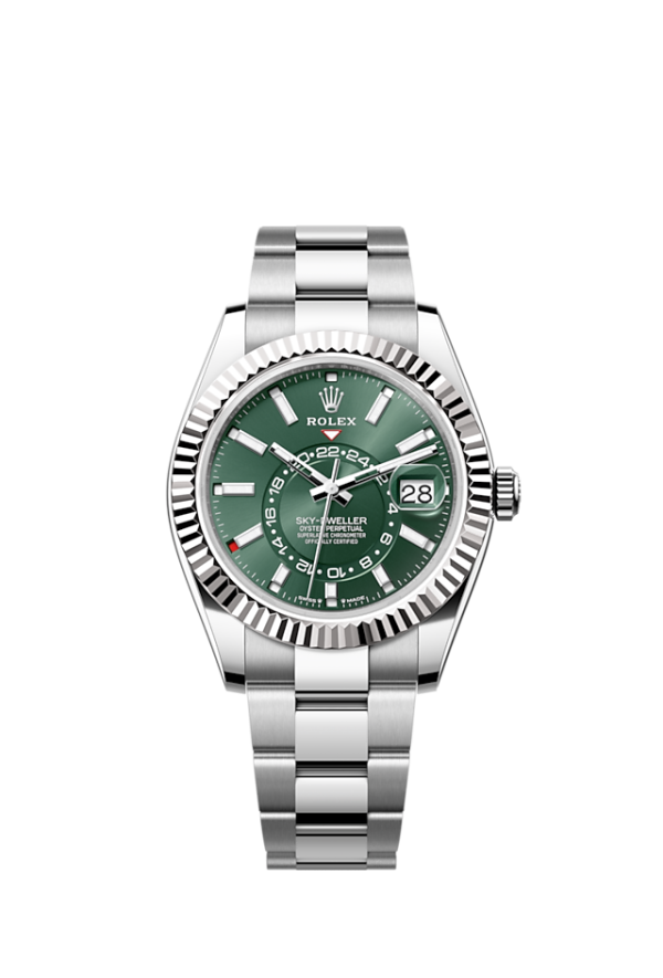 Unworn watch Rolex Sky-Dweller, 42mm, Oystersteel and 18k White Gold, Ref# 336934-0001. New for 2023, a true masterpiece of engineering. Elegant and versatile, this stunning timepiece is the perfect luxury accessory for the modern traveler. This superb chronometer features an Mint green dial, which is the perfect backdrop for the luminous 18k White Gold index hour markers and hands, making it easy to read the time even in low light conditions. A well-readable minute scale is applied along the outer contour of the dial. The sophisticated multi-function display makes it easy to keep track of the time in two different time zones. The reference time is displayed in 24-hour format on an off-center dial, while the local time is read using the normal central hands. The annual calendar, named Saros, is powered by a patented mechanism and features an innovative display: the months of the year are shown in 12 windows around the circumference of the dial, behind the hour marker – the current month is displayed in red. The instantaneous date change is related to local time. The ribbed, easy-to-grip Triplock Oystersteel screw-down crown features a triple water-resistance system in and Rolex logo decorated. The dial is covered with a scratch-resistant sapphire crystal with anti-reflective coating and Cyclops lens at the 3 o’clock position. The fluted bezel in 18k White Gold is a true hallmark of Rolex. Bidirectional rotatable, it is part of the Ring Command system and, when interacting with the crown, allows the user to select watch functions one by one and adjust them easily, quickly and simply. The model is powered by the innovative in-house Rolex mechanical movement, caliber 9002, contains 29 jewels and has an approximate power reserve of approximately 72 hours. This delightful timepiece is presented on an Oyster bracelet with one-piece three-piece links in Oystersteel. Thanks to the new hidden fastening system under the bezel, there is a perfect visual continuity between the bracelet and the case. The bracelet features an Oysterclasp folding clasp with Rolex’s original Easylink patented quick extension system of approximately 5mm for added comfort in all circumstances. Water resistant up to 100m/330ft (10 ATM).