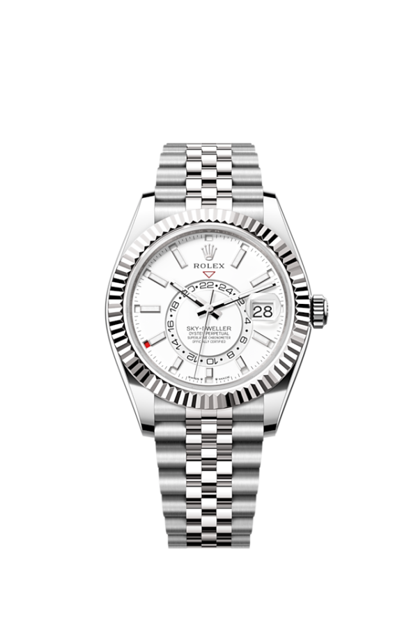 Unworn watch Rolex Sky-Dweller, 42mm, Oystersteel and 18k White Gold, Ref# 336934-0004. New for 2023, a true masterpiece of engineering. Elegant and versatile, this stunning timepiece is the perfect luxury accessory for the modern traveler. This superb chronometer features an Intense white dial, which is the perfect backdrop for the luminous 18k White Gold index hour markers and hands, making it easy to read the time even in low light conditions. A well-readable minute scale is applied along the outer contour of the dial. The sophisticated multi-function display makes it easy to keep track of the time in two different time zones. The reference time is displayed in 24-hour format on an off-center dial, while the local time is read using the normal central hands. The annual calendar, named Saros, is powered by a patented mechanism and features an innovative display: the months of the year are shown in 12 windows around the circumference of the dial, behind the hour marker – the current month is displayed in red. The instantaneous date change is related to local time. The ribbed, easy-to-grip Triplock Oystersteel screw-down crown features a triple water-resistance system in and Rolex logo decorated. The dial is covered with a scratch-resistant sapphire crystal with anti-reflective coating and Cyclops lens at the 3 o’clock position. The fluted bezel in 18k White Gold is a true hallmark of Rolex. Bidirectional rotatable, it is part of the Ring Command system and, when interacting with the crown, allows the user to select watch functions one by one and adjust them easily, quickly and simply. The model is powered by the innovative in-house Rolex mechanical movement, caliber 9002, contains 29 jewels and has an approximate power reserve of approximately 72 hours. This delightful timepiece is presented on a Jubilee bracelet with five-piece links in Oystersteel. Thanks to the new hidden fastening system under the bezel, there is a perfect visual continuity between the bracelet and the case. The bracelet features an Oysterclasp folding clasp with Rolex’s original Easylink patented quick extension system of approximately 5mm for added comfort in all circumstances. Water resistant up to 100m/330ft (10 ATM).
