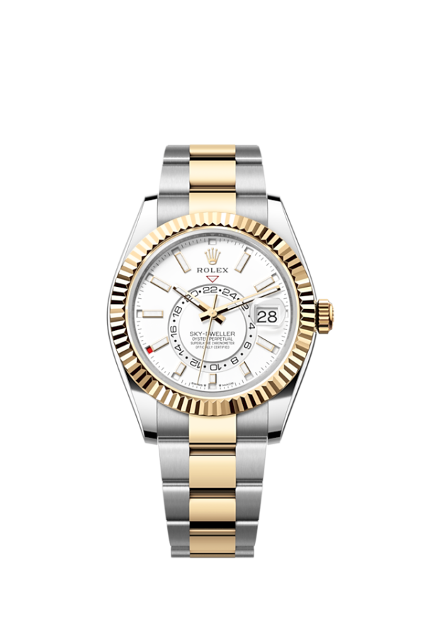 Unworn watch Rolex Sky-Dweller, 42mm, Oystersteel and 18k Yellow Gold, Ref# 336933-0005. New for 2023, a true masterpiece of engineering. Elegant and versatile, this stunning timepiece is the perfect luxury accessory for the modern traveler. This superb chronometer features an Intense white dial, which is the perfect backdrop for the luminous 18k Yellow Gold index hour markers and hands, making it easy to read the time even in low light conditions. A well-readable minute scale is applied along the outer contour of the dial. The sophisticated multi-function display makes it easy to keep track of the time in two different time zones. The reference time is displayed in 24-hour format on an off-center dial, while the local time is read using the normal central hands. The annual calendar, named Saros, is powered by a patented mechanism and features an innovative display: the months of the year are shown in 12 windows around the circumference of the dial, behind the hour marker – the current month is displayed in red. The instantaneous date change is related to local time. The ribbed, easy-to-grip Triplock 18k Yellow Gold screw-down crown features a triple water-resistance system in and Rolex logo decorated. The dial is covered with a scratch-resistant sapphire crystal with anti-reflective coating and Cyclops lens at the 3 o’clock position. The fluted bezel in 18k Yellow Gold is a true hallmark of Rolex. Bidirectional rotatable, it is part of the Ring Command system and, when interacting with the crown, allows the user to select watch functions one by one and adjust them easily, quickly and simply. The model is powered by the innovative in-house Rolex mechanical movement, caliber 9002, contains 29 jewels and has an approximate power reserve of approximately 72 hours. This delightful timepiece is presented on an Oyster bracelet with one-piece three-piece links in Oystersteel and 18k Yellow Gold. Thanks to the new hidden fastening system under the bezel, there is a perfect visual continuity between the bracelet and the case. The bracelet features an Oysterclasp folding clasp with Rolex’s original Easylink patented quick extension system of approximately 5mm for added comfort in all circumstances. Water resistant up to 100m/330ft (10 ATM).
