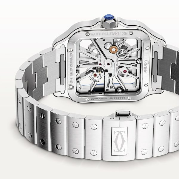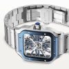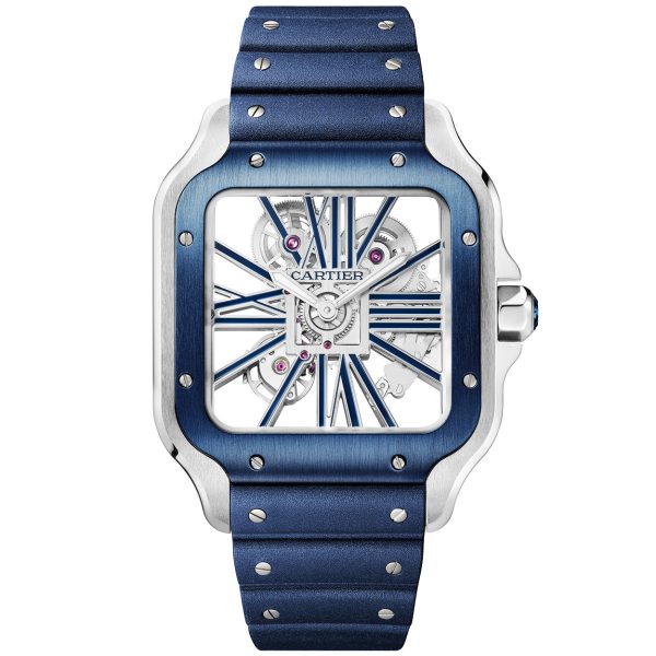 Cartier Santos de Cartier Large Skeleton/Blue Dial Men’s Watch WHSA0026. Stainless steel 47.5mm x 39.7mm case and blue bezel all on a matching stainless steel bracelet and comes complete with complimentary blue rubber strap. This men’s watch features a skeleton dial with blue structure. Synthetic sapphire crystal glass and water resistant up to 100m. Power reserve up to 72 hours. Manual-wind movement.