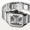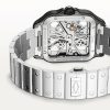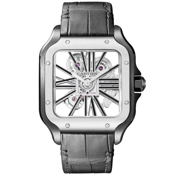 Cartier Santos de Cartier Large Skeleton Steel & Black ADLC Watch WHSA0027. Stainless steel & black ADLC coated steel 47.5mm x 39.7mm case and bezel all on a steel bracelet and comes complete with complimentary grey alligator strap. This men’s watch features a black skeleton dial with luminescent coating. Synthetic sapphire crystal glass and water resistant up to 100m. Power reserve up to 72 hours. Manual-wind movement.