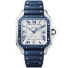 Cartier Santos de Cartier Large Steel & Silver/Blue Dial Men’s Automatic Watch WSSA0047. Stainless steel 47.5mm x 39.8mm case and blue PVD coated horizontal patterned bezel all on a stainless steel bracelet and comes complete with an additional blue rubber strap. This men’s watch has a striped silver dial with blued hands and roman numerals, date display at the 6 o’clock position. Water resistant up to 100m and sapphire crystal glass. 42 hour power reserve. Automatic movement.