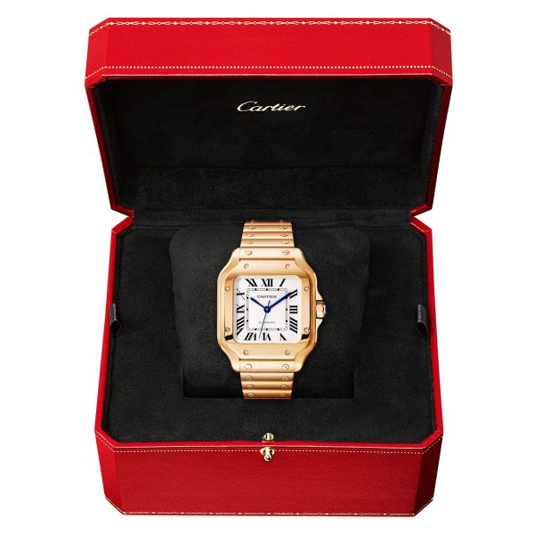 Cartier Santos de Cartier Medium Automatic 18ct Rose Gold Bracelet Watch WGSA0031. 18ct rose gold 35.1mm case and set bezel all on a 18ct rose gold bracelet and comes complete with an additional grey leather strap. This watch features a silver sunray dial with blued hands and black hour numerals. Water resistant up to 100m and sapphire crystal glass. Calibre 1847 MC automatic movement.